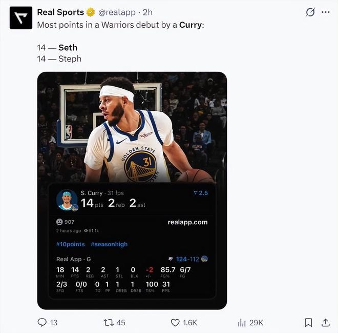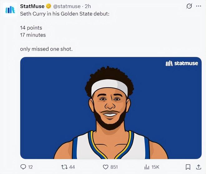 值得一提的是,塞斯与斯蒂芬在勇士队的第一场比赛都是拿14分,35岁的小库里比肩哥哥。