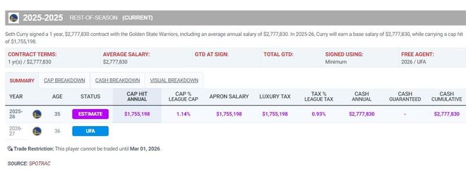 塞斯跟勇士队签下的合同是一年277万美元,只占用工资帽175万,所以勇士队签下他是非常之划算的,但他的加盟可能会影响希尔德、小佩顿、斯潘塞等人未来的登场时间。